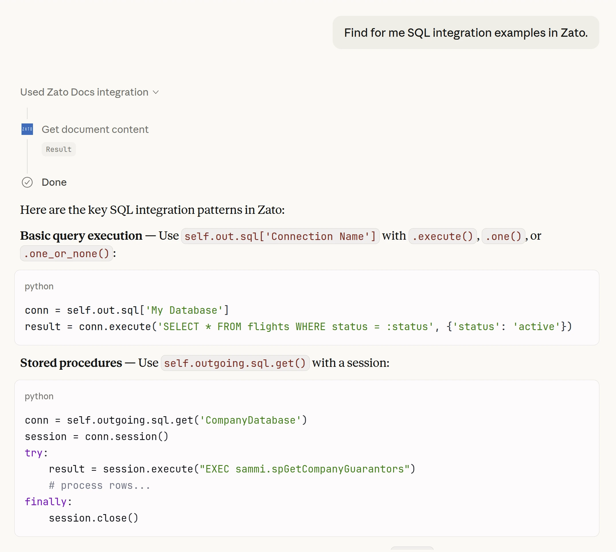 Your copilot or LLM will search the documentation, find the relevant pages, and give you answers based on what Zato actually supports - not what it thinks it might remember from training.