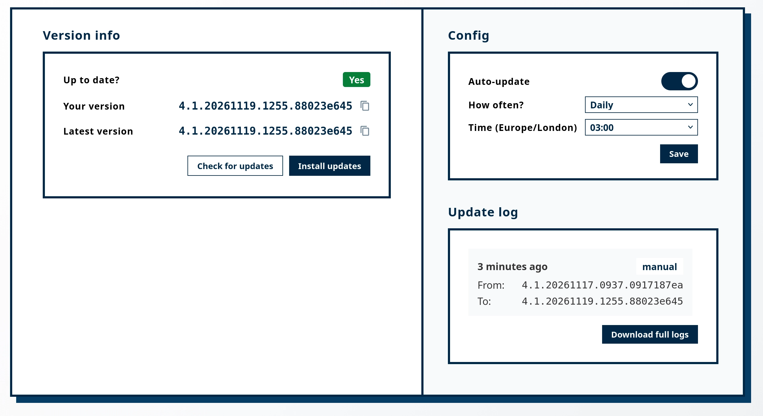 Automatic updates can be configured to run on a schedule. The following schedule types are available: