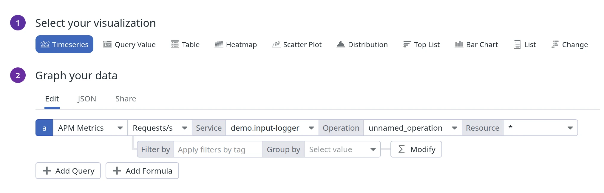 Since datadog automatically collects APM events from every traced request, you can build dashboards directly from this data by choosing APM Metrics as the data source for the dashboards.