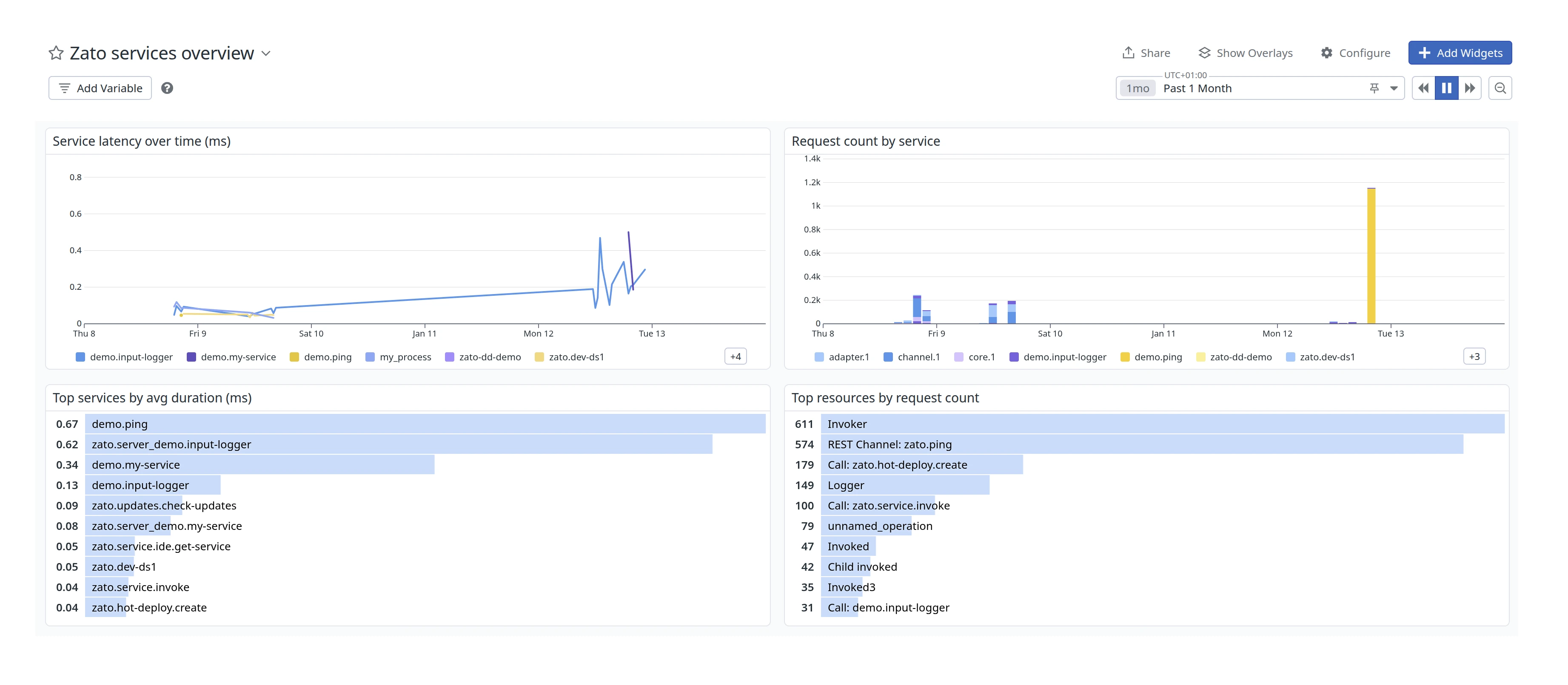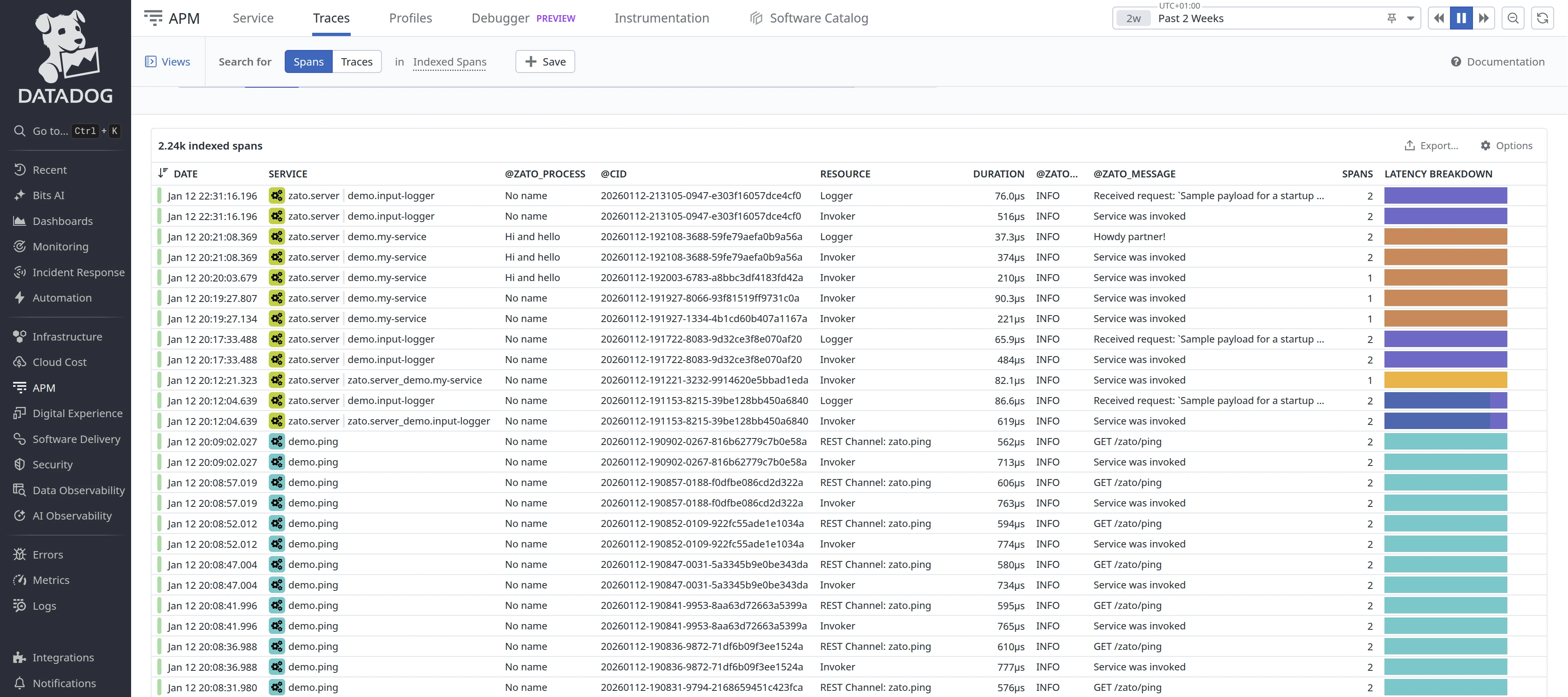 Zato's integration with Datadog APM (Application Performance Monitoring) gives you end-to-end observability across your entire API platform through distributed tracing.