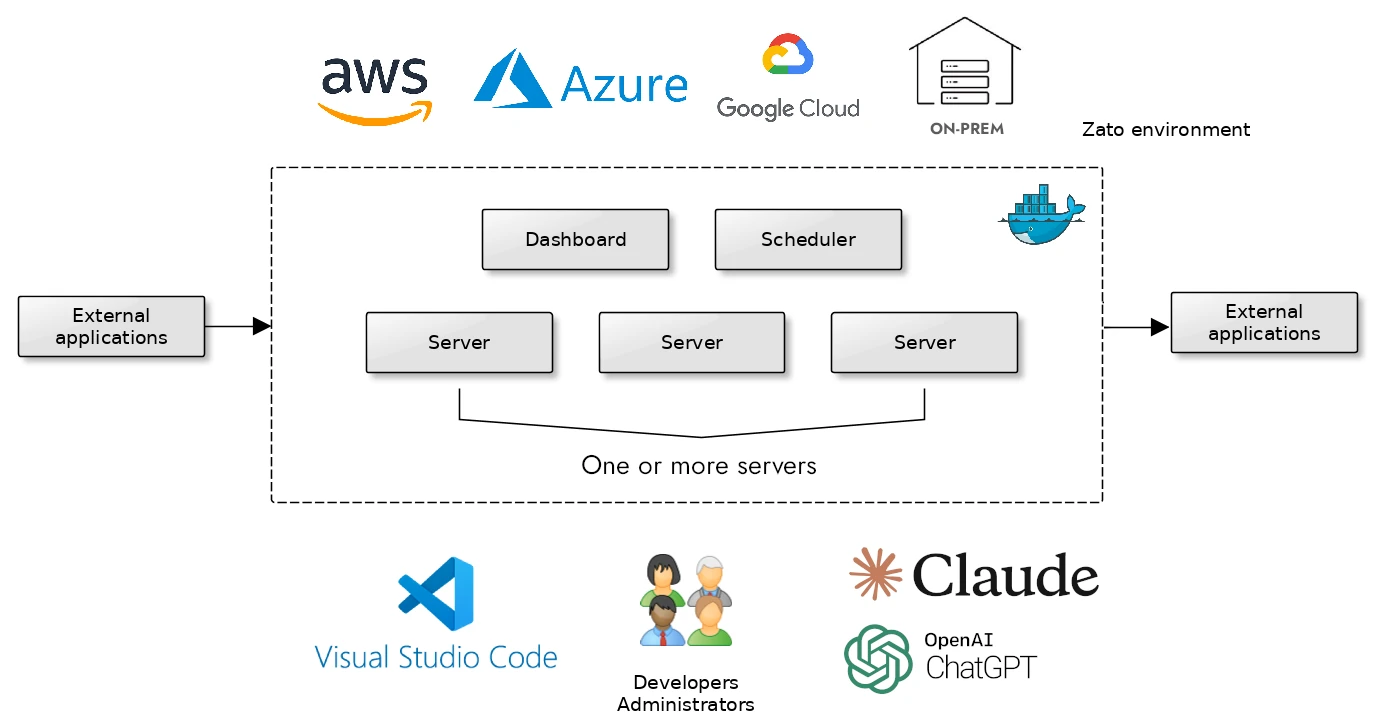 Each Zato environment is composed of one or more servers, each running in its own Docker Quickstart container, either in the cloud or on-prem. The environments can run in an active/standby or active/active mode.
