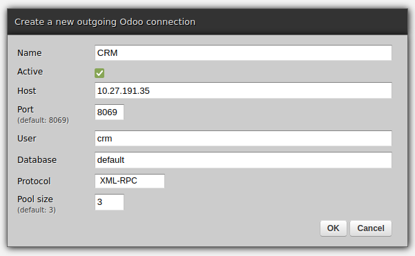 After creating an Odoo connection in Dashboard, connecting to its databases and issuing requests looks like as in the code below. Note that the underlying connections are based on openerp-client-lib and allow for everything the Odoo client supports.