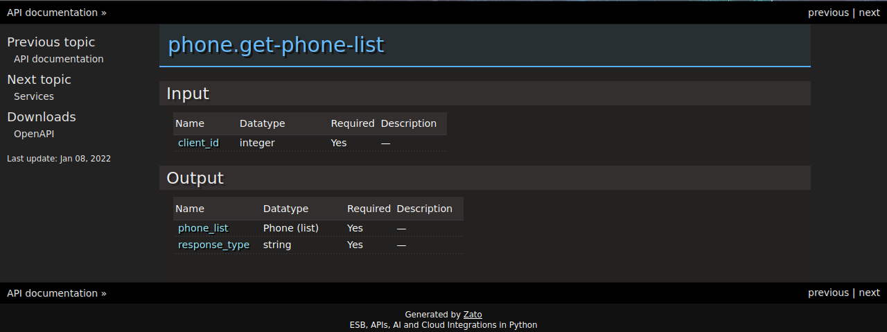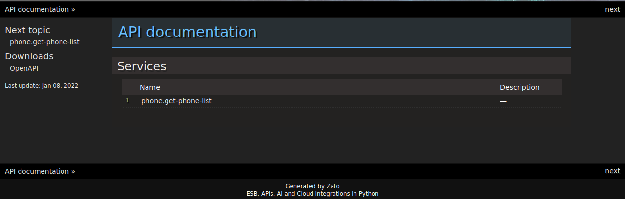 Use zato apispec from the command line to generate full API specifications, including both a static HTML site as well as OpenAPI.