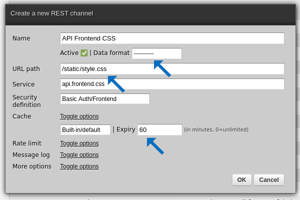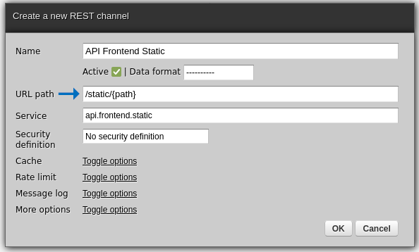Notice that the name of the path is now provided through a {path} parameter. When this channel is invoked, its underlying service, api.frontend.static, will receive this path on input. Once more, the value of the path can be arbitrary and it does not have to represent a real file on disk. Note also that caching is not enabled below - it is an optional feature that does not have to be enabled unless required.