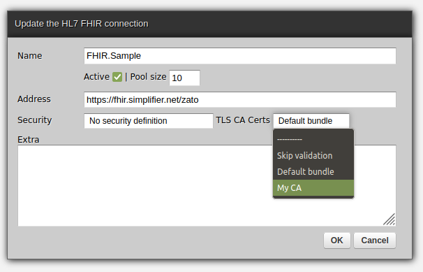 If the FHIR server that a connection points to uses SSL/TLS then a question arises of how to validate the certificate of the Certificate Authority (CA) that signed the certificate that the FHIR server uses. There are several options: