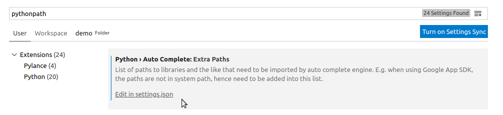 Open the user settings.json file in your VS Code instance. If you are not sure where it is, you can reach it through File -> Preferences -> Settings -> [search for pythonpath] -> Click "Edit in settings.json".