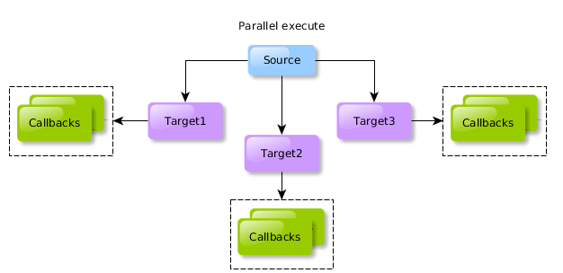 Target services run in parallel, asynchronously, and are not notified of each other's execution progress. All of the callbacks configured also run asynchronously without blocking each other.