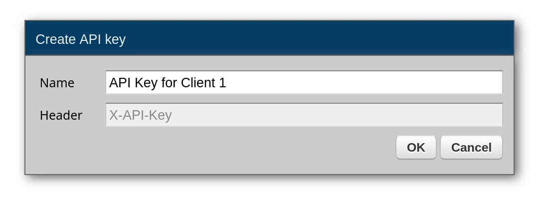 Each client application gets its own API key. Note that the header for the application to send is always X-API-Key and the value of this key is sent directly in that header.