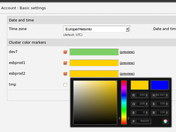A single Dashboard instance can be used to handle multiple environments, such as production, tests and development, and to help you with differentiating which environment you currently work with, you can assign a color to each Zato cluster so that, for instance, a production cluster will be in yellow while development will use green.