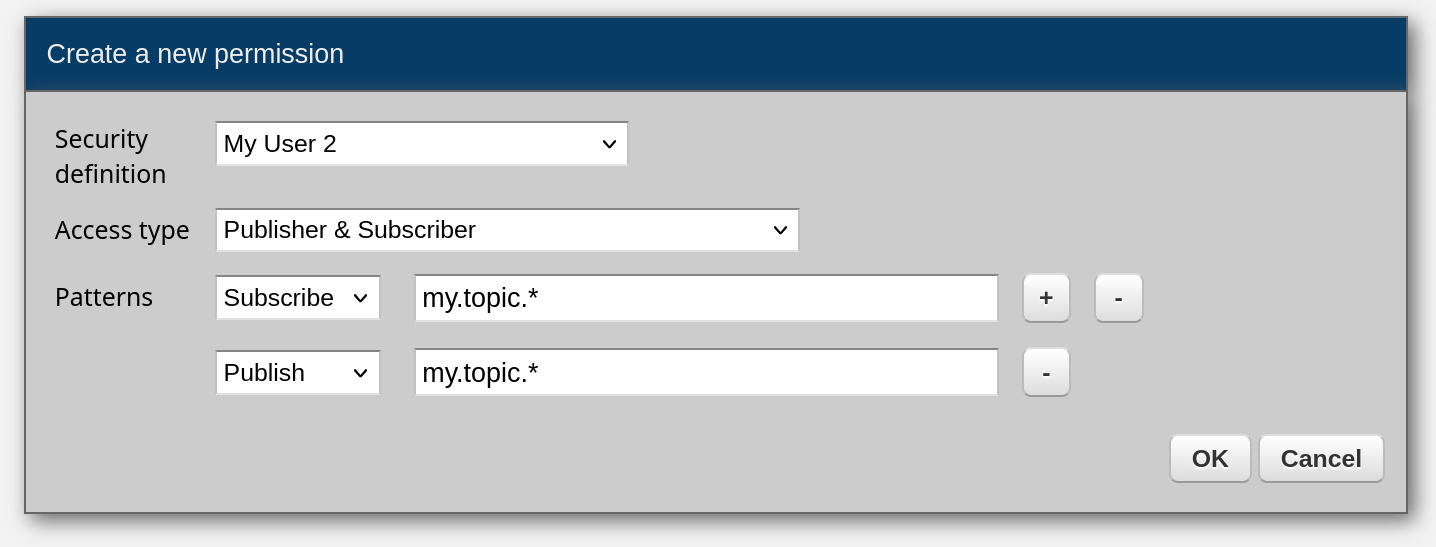 Each security definition can be a publisher, subscriber, or it can be both, and you can assign permissions to each role independently.