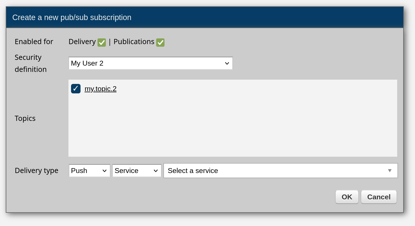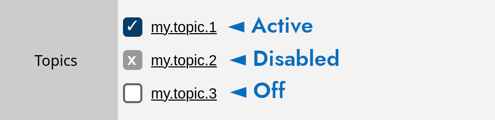 You can configure whether an existing subscription is enabled or not - separately for delivery and message publications. You can also configure whether the delivery for a subscription is active, temporarily disabled or off.
