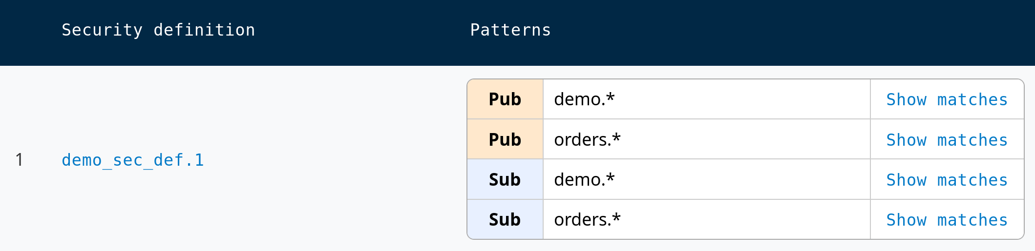 Authorization is based on patterns - for each endpoint, a list of patterns can be created, each pattern potentially resolving in run-time to one or more topics.