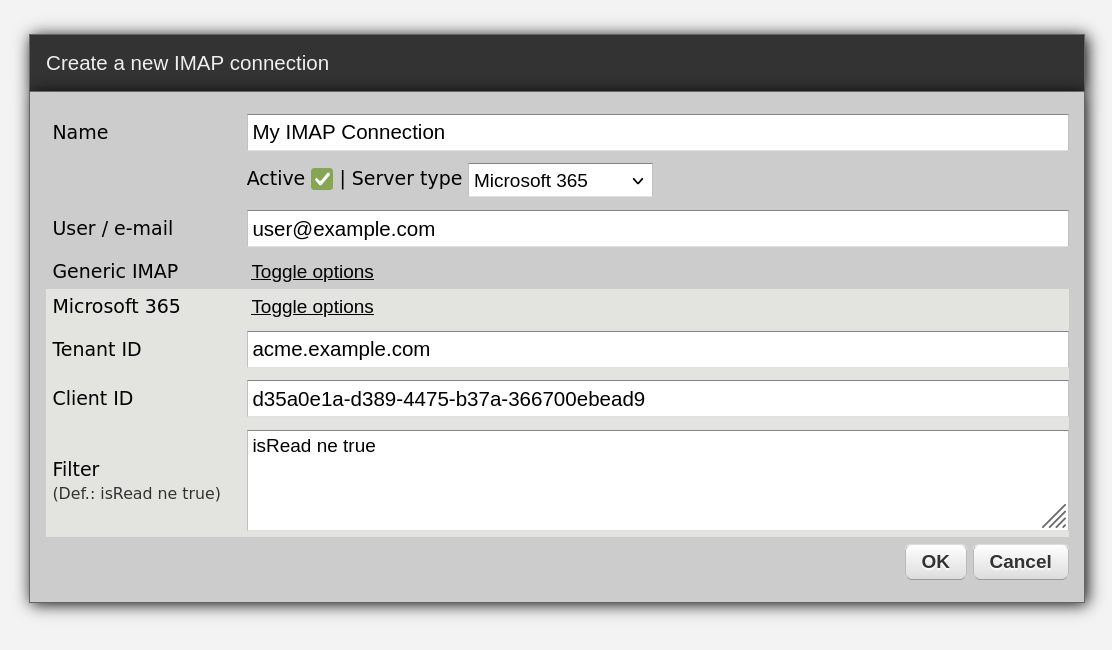 In the dashboard, go to Vendors → Microsoft → 365 → IMAP and fill out the form as below, making sure first that you select "Microsoft 365" for the server type. Afterwards, click "Change secret" and enter your client's secret.